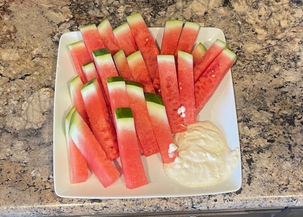 Once you get home wash that baby up and then cut it in half! Lay one half face down and cut across in slices, turn the watermelon a quarter of a turn and cut in slices again! This gives you the perfect slice for grabbing a stick of watermelon and is so great for dipping!